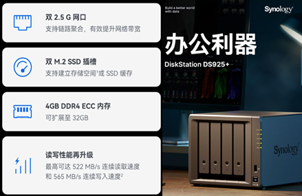 | 群晖DS925+(4盘位可扩9盘位) | 4580 | 4盘位(可扩充至9盘) | 只支持群晖原装硬盘80+100TB | AMD Ryzen™ V1500B 四核2.2G CPU | 4GB DDR4 ECC SODIMM(可扩充到 32GB) | 3年 | 2.5G网卡*2,USB3.2*2 | |||||||